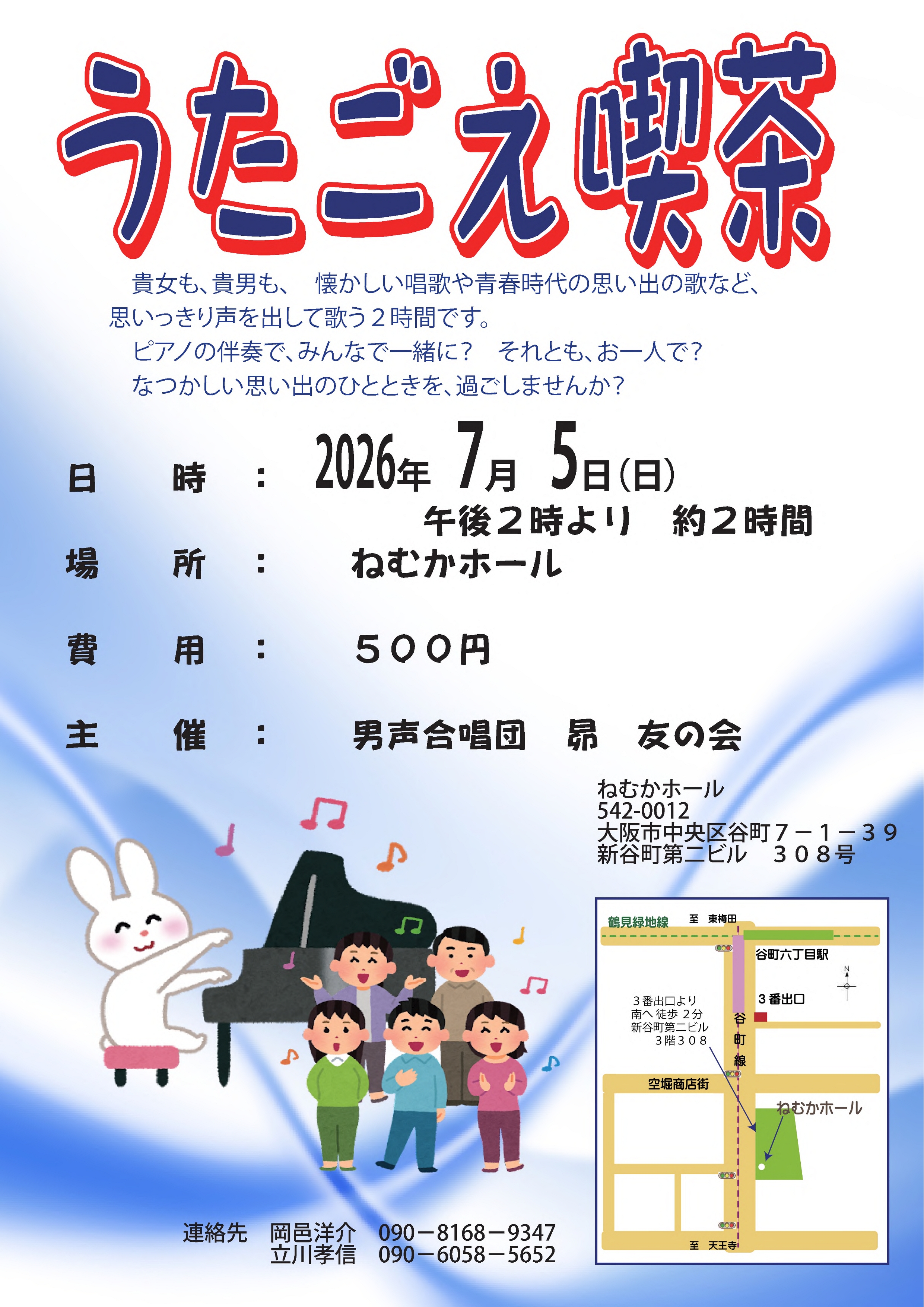 2026年4月 6日 団員専用ページ内音源欄に、 25周年歌集の曲、及びLove以外の曲のスコメ音源を、載せました。 各自ダウンロードの上、歌詞を覚えるために、使ってください。